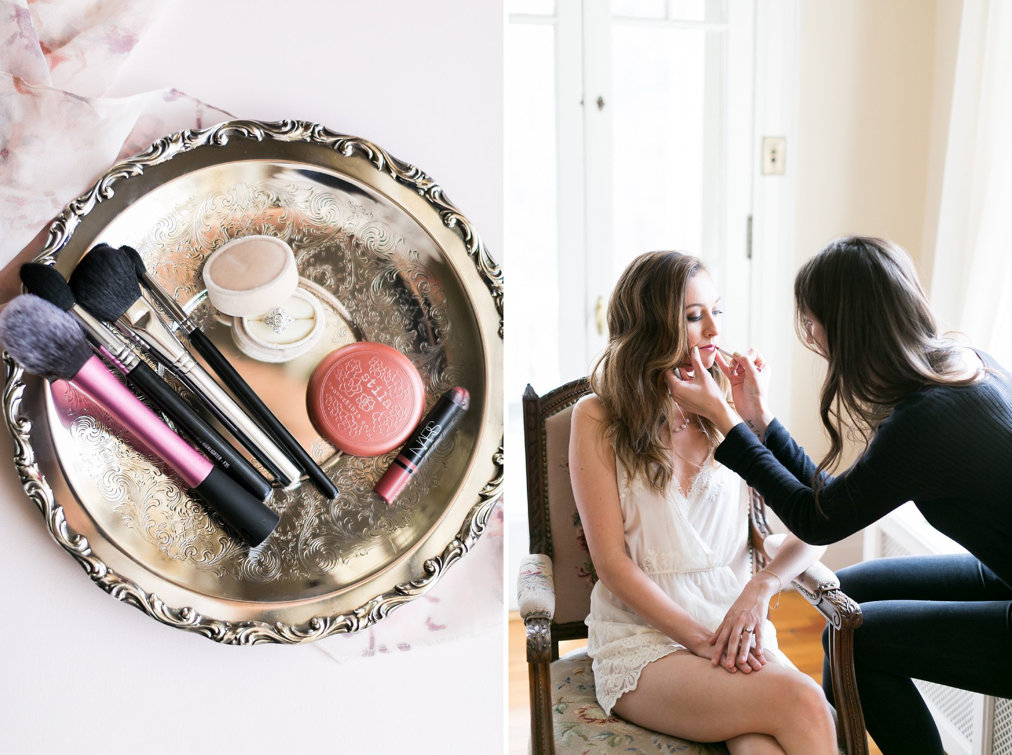I highly recommend having a light filled room to do your hair and makeup in. Oftentimes you end up in a dark backroom somewhere, and you really want the space to feel calming for you all! This helps your makeup artist see things in natural light which is super important, but it also allows for great photo moments. Just make sure to think this through when walking through your venue. I highly recommend having a separate space to keep bags, wedding things, and such that will clutter the space. Also keeping everyone’s bags organized helps later when you are all changing into your dresses, and putting things you aren’t wearing away in their dedicated spot is super helpful. It saves you later that night so you won’t be scrambling to find little things you kept here, there, and everywhere. This does allow for great photos, but also keeps the getting ready process feeling intimate and beautiful.