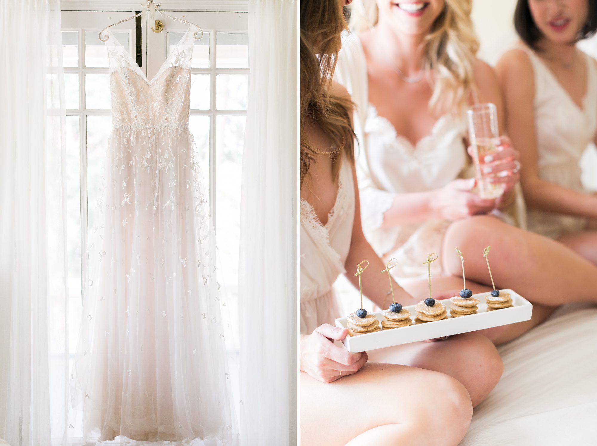 Something that is often forgotten on a wedding day is the food. of course you have planned a fabulous dinner for your guests in the evening. But remember that you might then be skipping both breakfast and lunch, depending on what time your ceremony is, and therefore what time you start getting ready. Be sure to have some food for your girls so they can snack in-between hair and makeup. Three tomatoes Catering brought in the most incredible brunch for us. I was absolutely obsessed with the mini pancakes, and tiny avocado toasts! What could be better than a super cute brunch the morning of your wedding.
